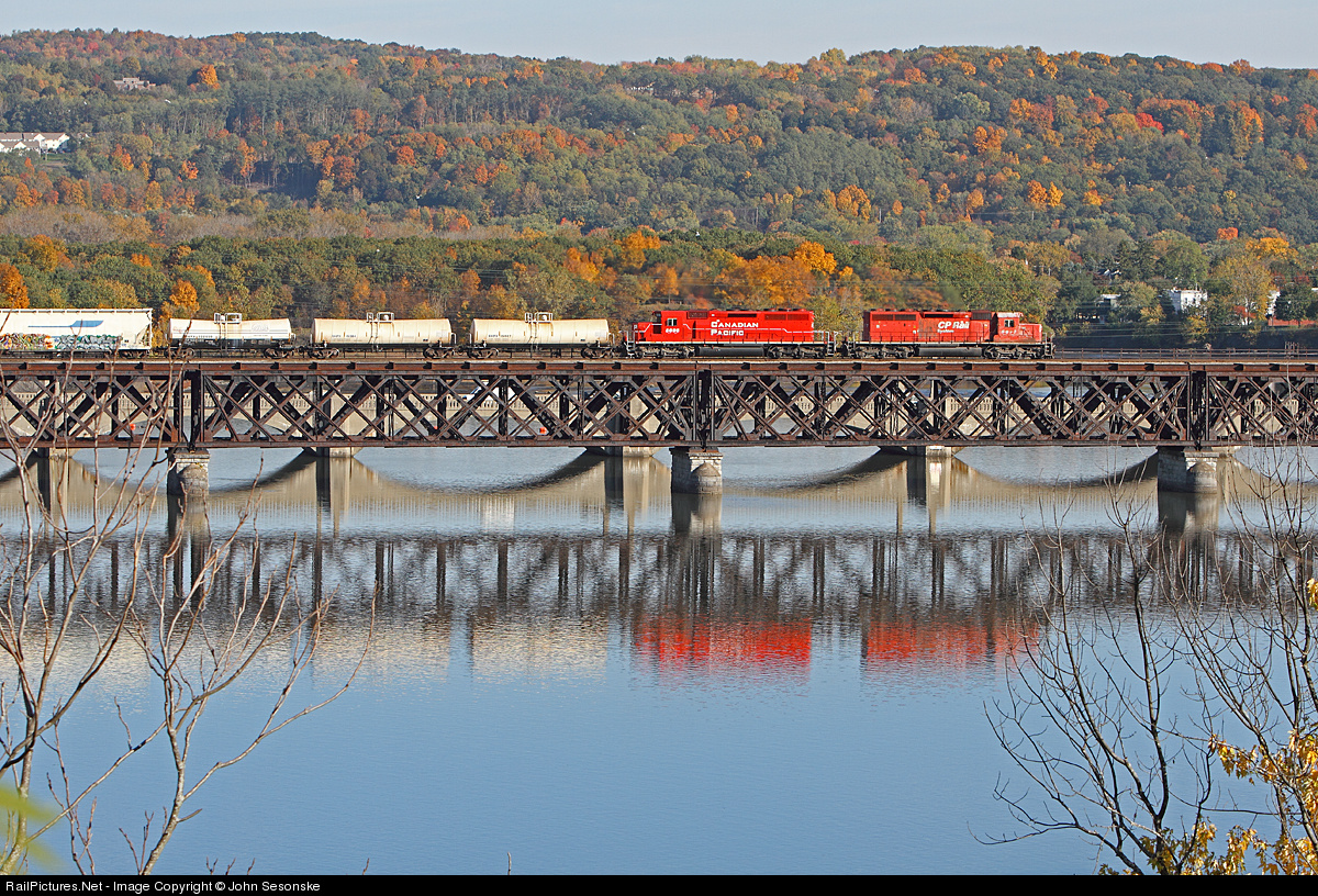 A contrast in paint as a clean CP 5698 in the current paint scheme trails the CP 5677 in a well worn version of the NAFTA scheme where the dual flags have been peeled off. The Saratoga to Kenwood (Port of Albany, NY) turn job rolls SB across the Mohawk River on a nice Fall afternoon with the hills of Troy, NY providing a Fall color bathed back drop.