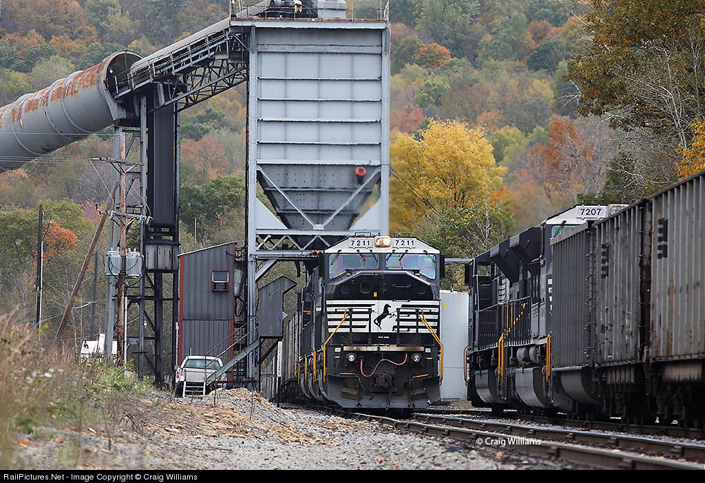 | An empty NS coal train begins to load coal at the Rosebud Mine 78 east of Windber. The train came out of South Fork, PA, with manned power on both ends. The train is splits into 2 chunks to load the train. The rear end of the train is to the right and will load once the head end is done. This branch has the base for the ex-Conrail SD80MAC's. |