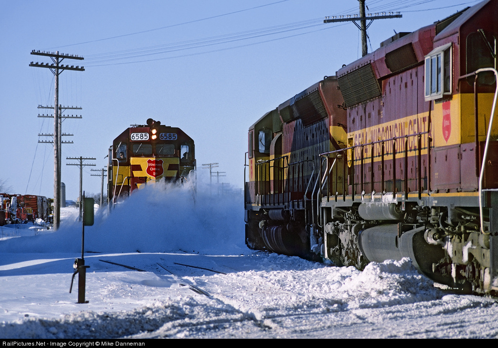| Wisconsin Central train No. 46 with SD45 6585 on the point is meeting train No. 49 at Bryon, Wisconsin, on a clear and snowy January 27, 1996. |