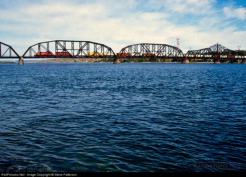 With two leased ex-CP SD40-2s, CP 6077 in the lead, a westbound DM&E freight crosses the Missouri River at capitol city Pierre, S.D. on Oct. 4, 1999, headed for Rapid City.