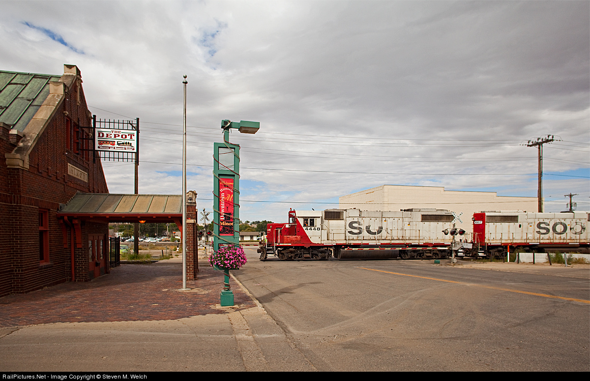 | The Minot Switch shoves back to their yard, passing the old Soo Line depot, after interchanging with the BNSF. |