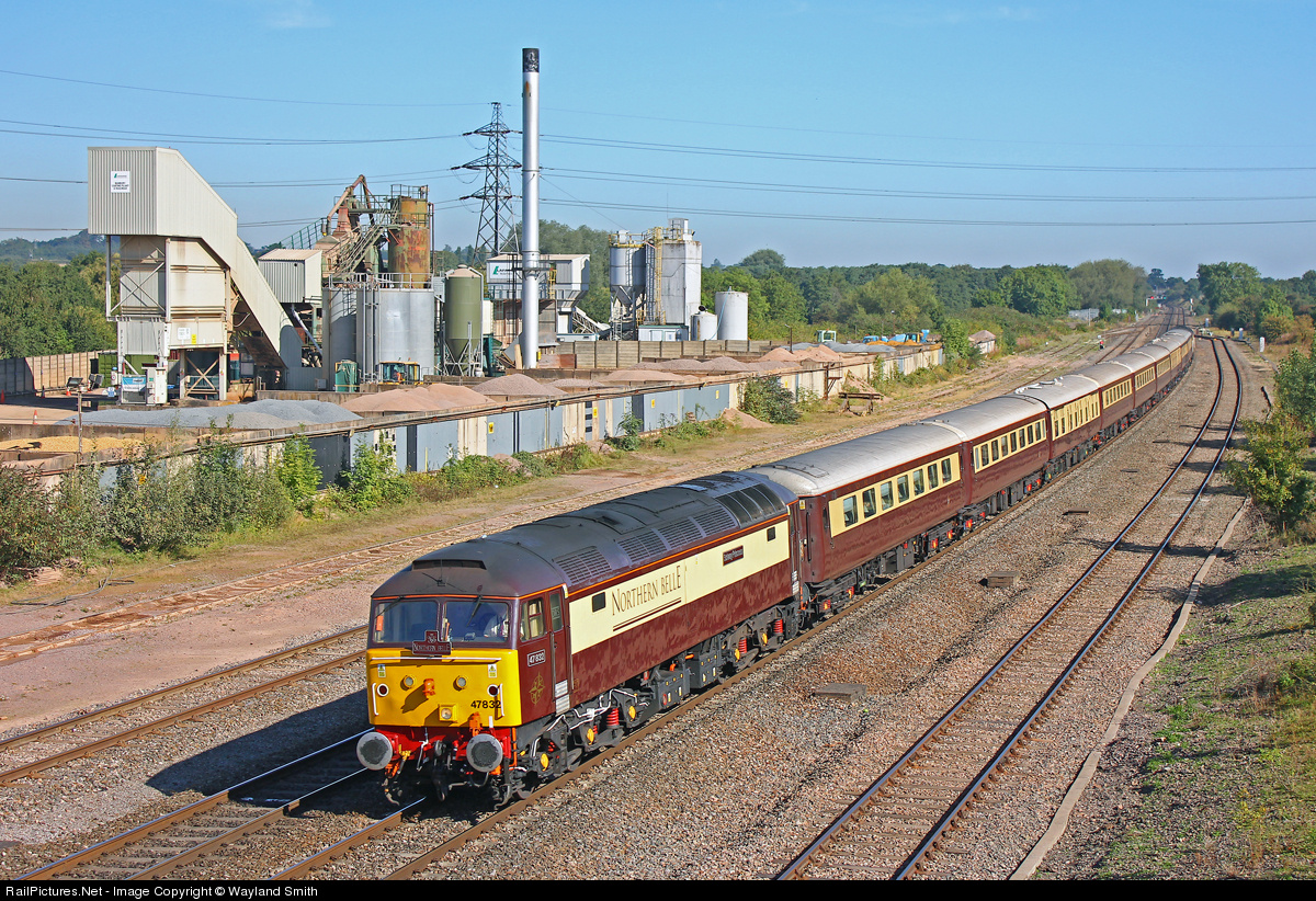 | 47832 hurries past Banbury Cement Works on the northern frine of Banbury with the Northern Belle Pullman Dining excursion train. The locomotives dedicated to work this train have been painted in a matching colour scheme. |