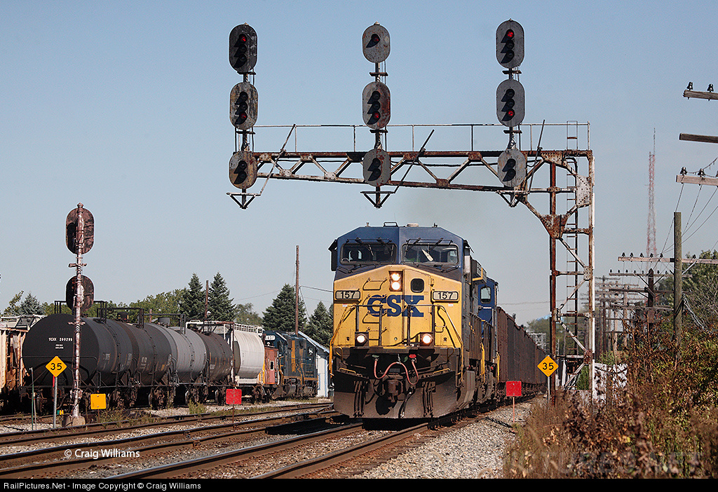 Loaded ore train heads thru Fostoria and is passing west end of B&O center siding. The train has just pasted F-Tower and over CSXT busy east-west main to Chicago, and NS main to Ft. Wayne. This train will continue south towards Columbus, OH, and on to Russell, KY.
