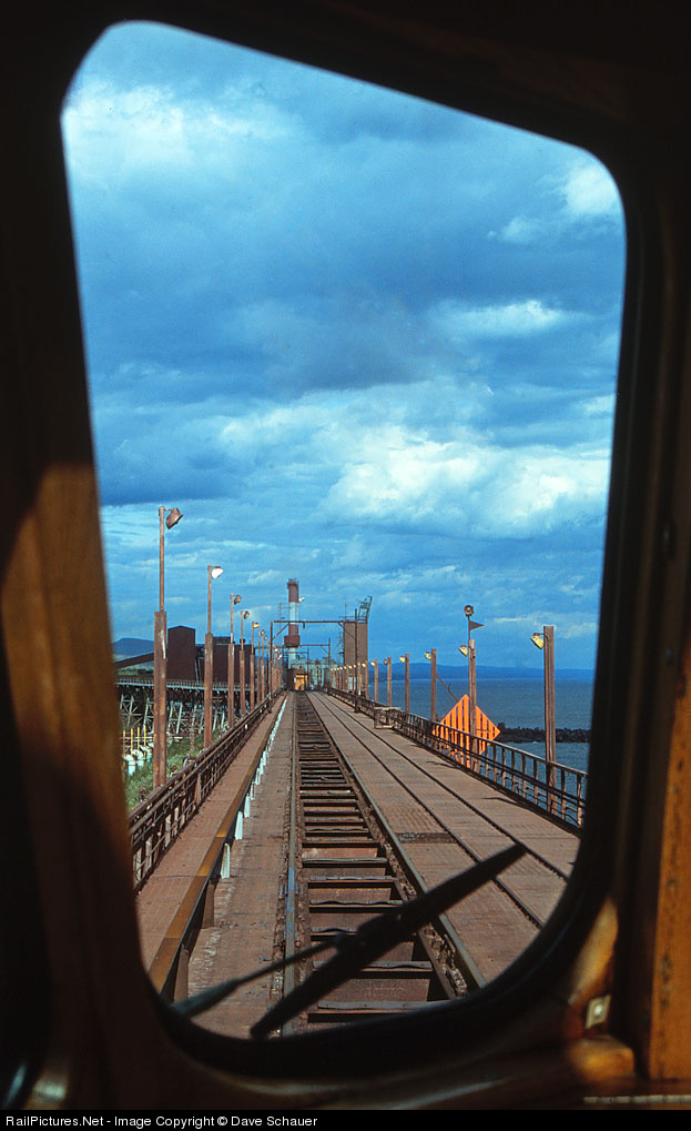 | Paying first class to ride in the Milwaukee Road Skytop Cedar Rapids over the former LTVSMC dock at Taconite Harbor in 2002 was worth every penny. The sun came out and illuminated the shuttered dock as we rolled across. This was during a fundraising train operated by the Lake Superior Railroad Museum and Cliffs Erie. |