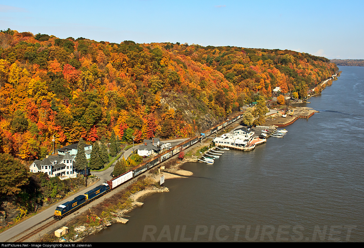 With the autumn colors at peak, CSXT engine 9050 leads a mixed frieght south along the Hudson River on the CSX River Line.