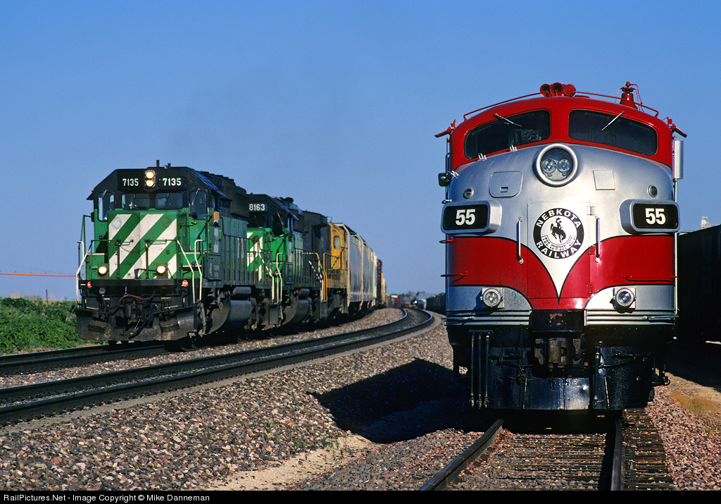 Nebkota FP7 No. 55 rests for the afternoon while being used to switch the grain elevator at Hemingford, Nebraska, on June 12, 1998. A westbound BNSF freight pounds by on the adjoining Butte Subdivision. Later in 1998, No. 55 will be sold to Canadian Pacific to power the railroad’s Royal Canadian Pacific passenger train, repainted maroon and gray, and renumbered 1400 in the process.