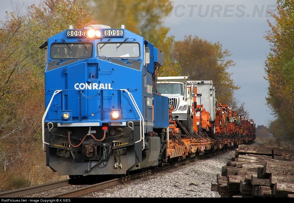 The Conrail heritage unit #8098 leads NS 924 Southbound on the NS Brooklyn District through Mount Olive, Illinois on 10/20/2012 headed for Coffeen Ameren Power plant with a MoW train.
