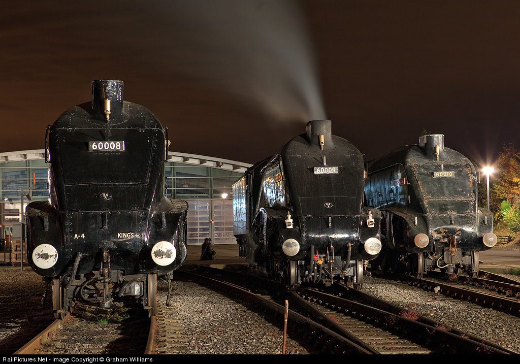 Well, the A4s finally got to the UK. 60008 Dwight D. Eisenhower from Green Bay, WI and 60010 Dominion of Canada from Montreal. Here we see them lined up with home based 60009 Union of South Africa, in sequential order, for a once-in-a-lifetime photoshoot at the National Railway Museum annex at Locomotion, Shildon, Co Durham. All three locos are in British Railways green. In the next two weeks, 60010 will be painted into LNER blue and the shot can never be repeated. An amazing sight, which is a curtain raiserf or the line up of all six surviving A4s next year. I haven't seen 60008 and 60010 since August 1962, when they were still in service. Fifty years ago!