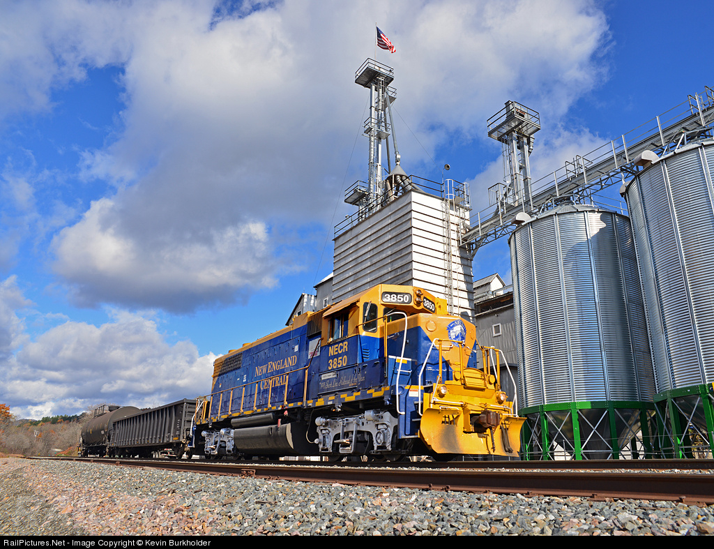| A southbound New England Central "Key Train" heads southbound through Bethel, Vermont and past the large Green Mountain Feed along the NECR Roxbury Subdivision. The Key Train is led by recently retouched GP38 3850. |