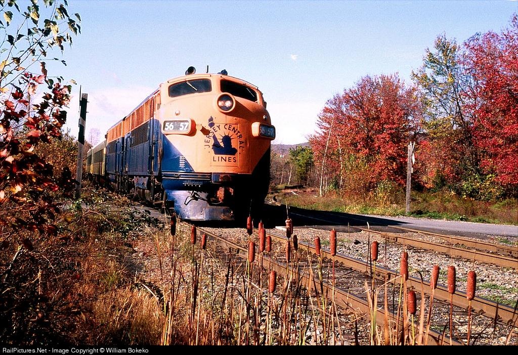| ARHS CNJ 56 and Tri-State NRHS CNJ 57,(ex-BAR units), on a Rail Tours Inc. Jim Thorpe to Hometown Fall Foliage excursion pass M.P. 9 and Industrial Road crossing on the Carbon & Schuylkill RR. The rail line is the former CNJ Nesquehoning Branch. |