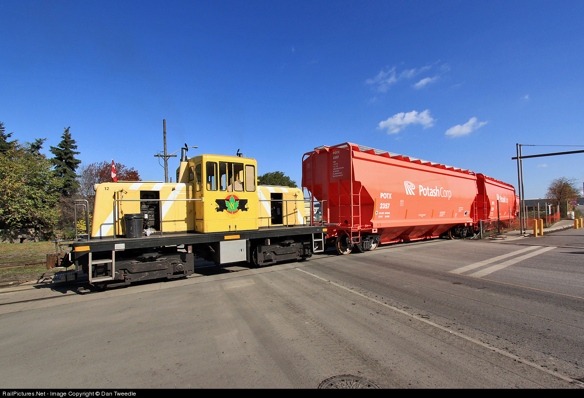 NSCX 12 brings a string of brand new Potash Corp. covered hoppers out of the paint shops to be lifted by SOR and eventually put on a CN train westward.