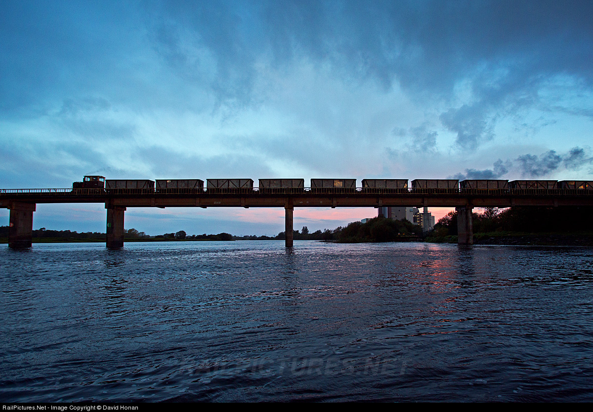 | The incipient sunrise turns clouds on the horizon pink as an empty rake departs West Offaly Power Station, crossing the River Shannon on its way to a peat bog in either Co. Galway or Roscommon. Four or five hours later this 16-car train will return loaded with about 100 tons of peat ready to be burned at the distant power plant to fire its boilers, and then head back out into the bogs for a second load before the driver's shift ends. |
