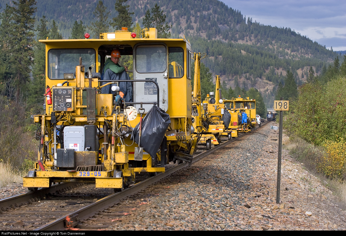 A "train" of Montana Rail Link track machinery, moves to get in the clear for MRL's Paradise Local which is waiting in the distance. The local is finishing switching chores at a lumber mill just west of St. Regis. The temperature was just about 60 degrees, as can be seen on the gauge mounted to the machine.