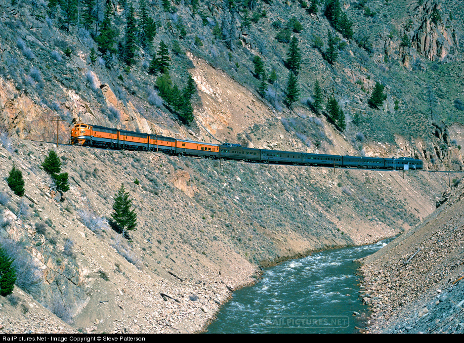A year before DRGW declined to join Amtrak, its Rio Grande Zephyr was running with just six cars as it was on this day about to leave Byers Canyon heading west. By this time of year, too, the spring runoff on the Colorado River was dropping. The D&RGW and now UP follow the Colorado for 238 miles, the longest any one RR in America follows the same river.