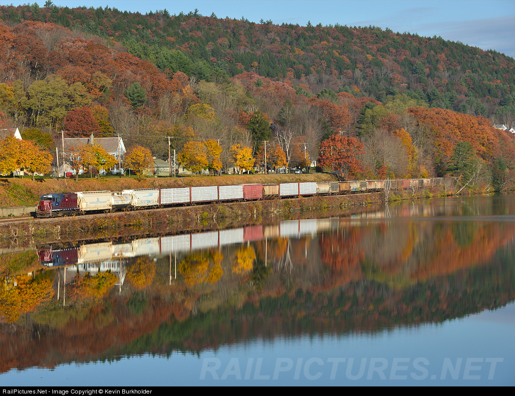 Vermont Rail System's Green Mountain Rail Company Bellows Falls Switcher - symbol DASW - is working along a very calm Connecticut River in Bellows Falls on a late fall morning of October 25.
