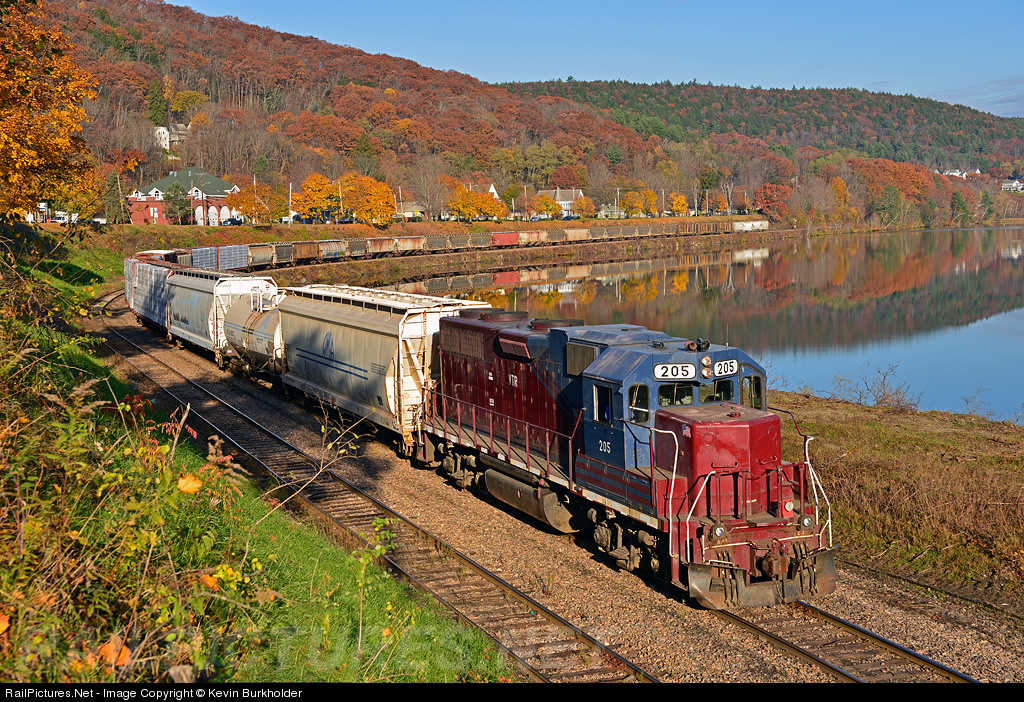 | Vermont Railway GP38-3 205 is seen working along the Connecticut River at Bellows Falls, Vermont on a late fall morning of October 25, 2012. The DASW (Bellows Falls Switcher) is seen arranging cars that were delivered to this location by the New England Central Railroad overnight... |