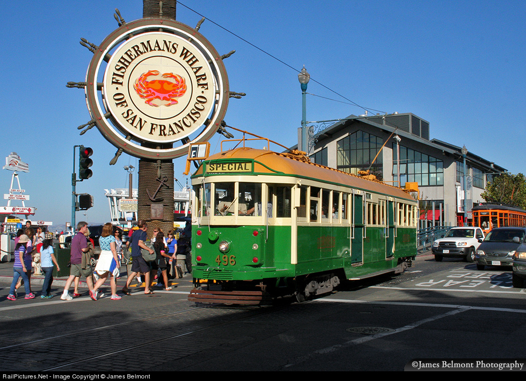 MUNI car 496 rambles along the historic F-Line at Fisherman's Wharf in San Francisco. The tram was built by Moore for the Melbourne & Metropolitan Tramways Board in Melbourne, Australia in 1928.