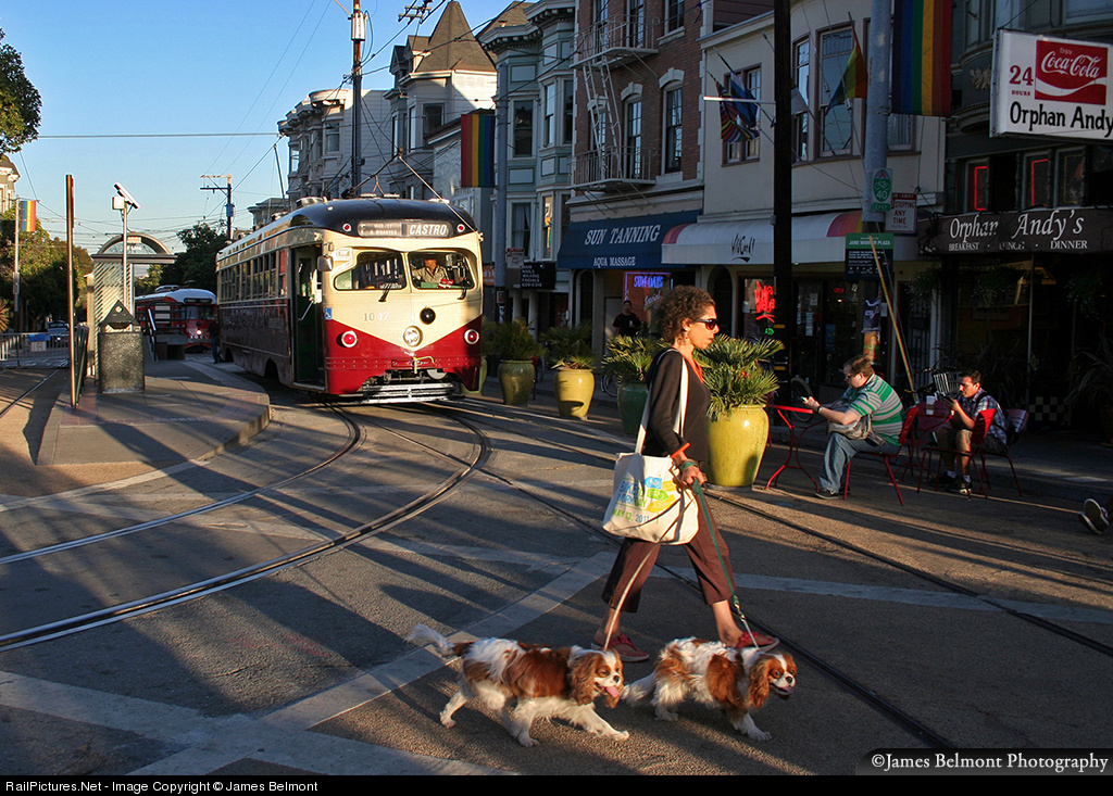 While a local resident struts her Cavalier King Charles Spaniels, MUNI car 1007 departs Castro Station for Fisherman's Wharf. This PCC streetcar, built by St. Louis Car Co. in 1948, is painted to commemorate Philadelphia Suburban Transportation Company, the 'Red Arrow' lines serving Philly's western suburbs, which ran interurban cars with some PCC features from 1949 to 1982.