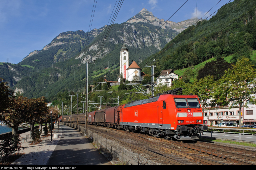 | On a glorious September afternoon a recently re-painted DB 185 electric approaches Fluelen station beside the Vierwaldstattersee (Lake Lucerne) with a southbound freight train bound for Italy. From Erstfeld a second 185 will be attached to the front of the train and possibly one at the rear to bank the train up the north ramp of the Gotthard to the tunnel. |
