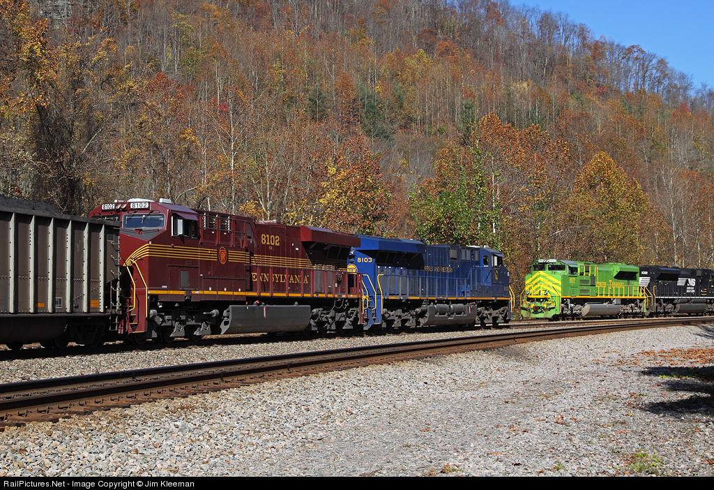 A heritage triple header! NS 1072 sits on track one ready to move east with train 576. On the center siding a J52 helper set with the PRR and N&W heritage units shoves 83G on the climb to Bluefield, WV. The gorgeous Indian Summer weather will soon give way to snow squalls and hurricane Sandy.