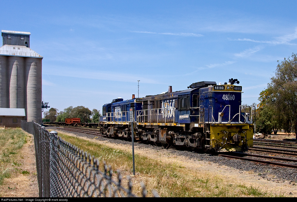Baby 6 cylinder ALCO's 48160 built Jul 1970 - 48139 built May 1969 idle in a siding at Narromine waiting to be added to a loaded grain train from Nyngan.