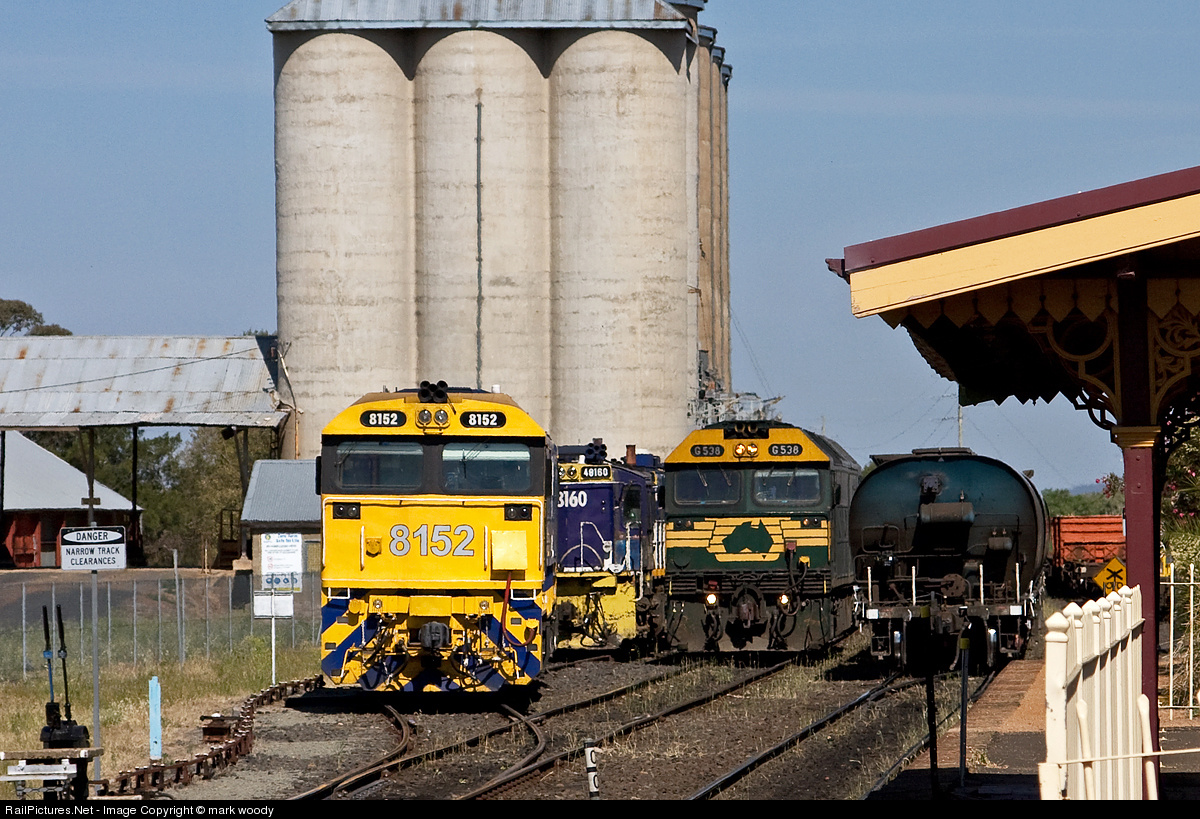 JT26C-2SS 8152 built Oct 1984 takes the siding to pick up DL531's 48160-48139 after arriving on the rear of the loaded grain train standing on the main, meanwhile JT26C-2SS G538 built May 1989 still in Freight Australia livery has run around and waits in the loop, it will couple to 8152 and again lead the train south to Parkes.