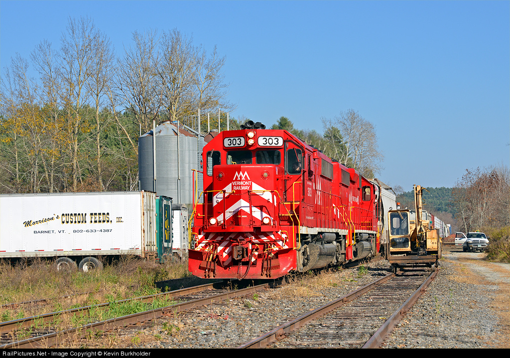 On the final day of matched Vermont Railway power on the Washington County's Connecticut River Division, train NPWJ is enroute from Newport to White River Junction, Vermont behind GP40-2 303 and GP40-2 307. The 303 will be swapped out for CLP GP40-2 306 upon arrival in White River, ending a week-long pairing of Vermont Railway units for Conn River Division. The NPWJ is rolling into East Barnet and Morrison's Feed to perform switching, as maintenance workers await the train's passage to go back to work.