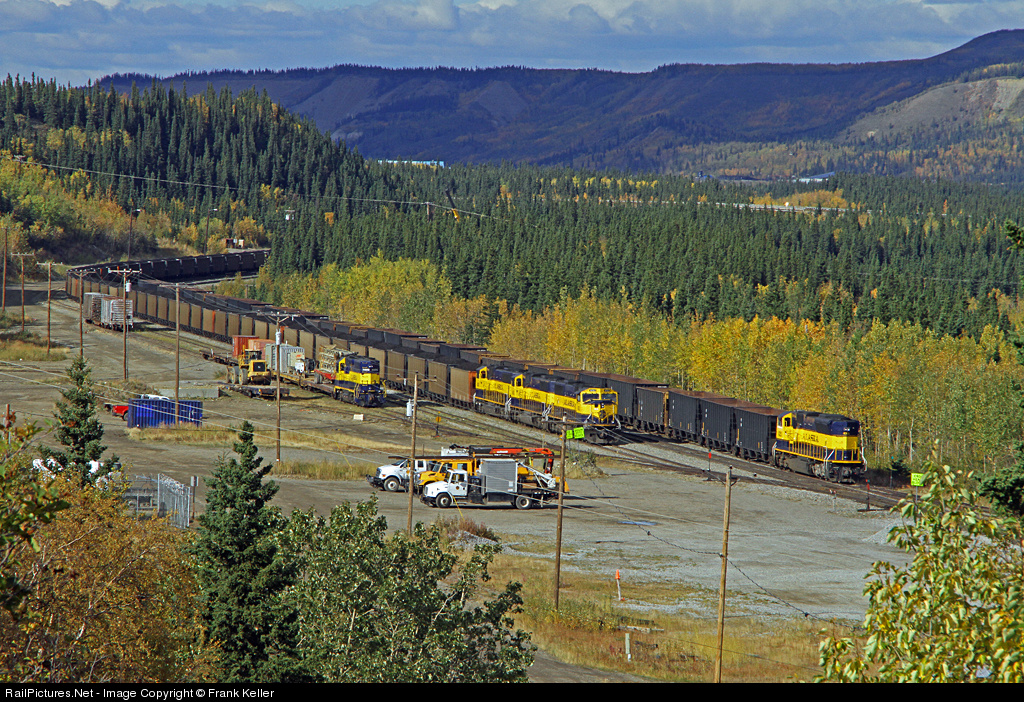 Sitting in the small yard at Healy, AK one can see the southbound loaded export coal led by SD70MAC 4012, in the track to the right is the local coal that will be loaded and forwarded to Fairbanks for local customers and then in the track to the right is the local that will soon head to Ferry the site of a large, by Alaska standards, windmill site. Once the local is done with the ferry work the 2006 will be recombined with 4325 and head to Fairbanks.