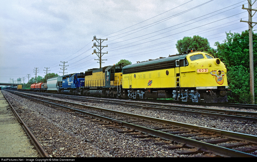An unusual power set leads a Chicago and North Western train leaving Butler Yard, Wisconsin, on a dreary May 15, 1985. Executive F7 No. 403 is leading two SD40s, one each of C&NW and Conrail, on this Chicago-bound freight.