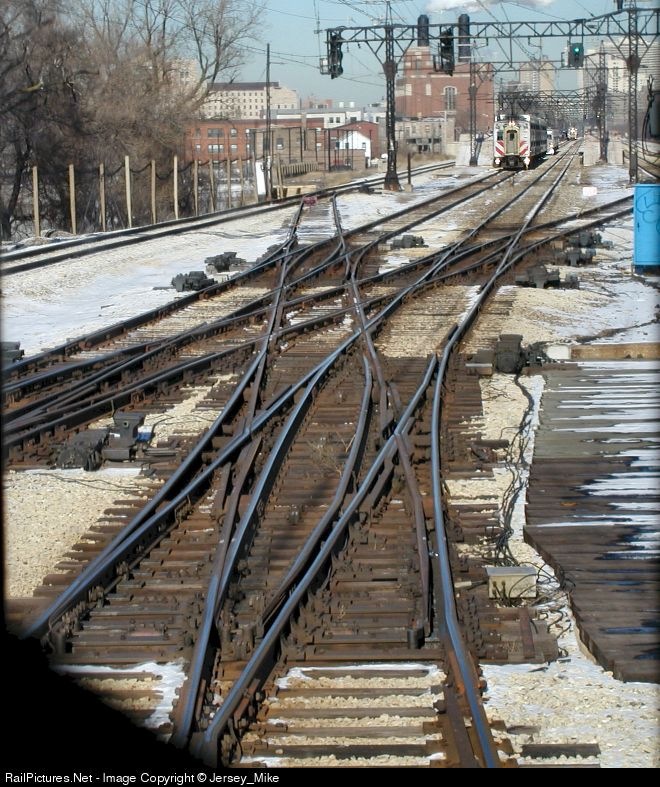2 Metra Hi-Liners and a South Shore MU wait to for a movement to clear the single tracking section over the double-slip scissors crossover at South Chicago interlocking.