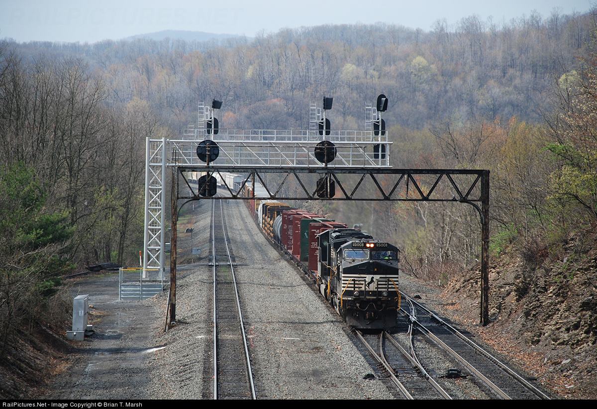 On a chilly late March morning NS C40-9W #9056 eases its train down from Horseshoe Curve and approaches the western edge of Altoona. During our travels to Altoona to cover the NS Heritage units we often found ourselves with some extra time to catch the beauty and history of the Altoona/ Horseshoe Curve area. History is coming to an end for the signal bridge and position signals that have stood guard here for many years. The modern signal bridge and signals as of now late spring 2012 been positioned and in effect also taking out the need for the historic ALTO Tower and its operators.