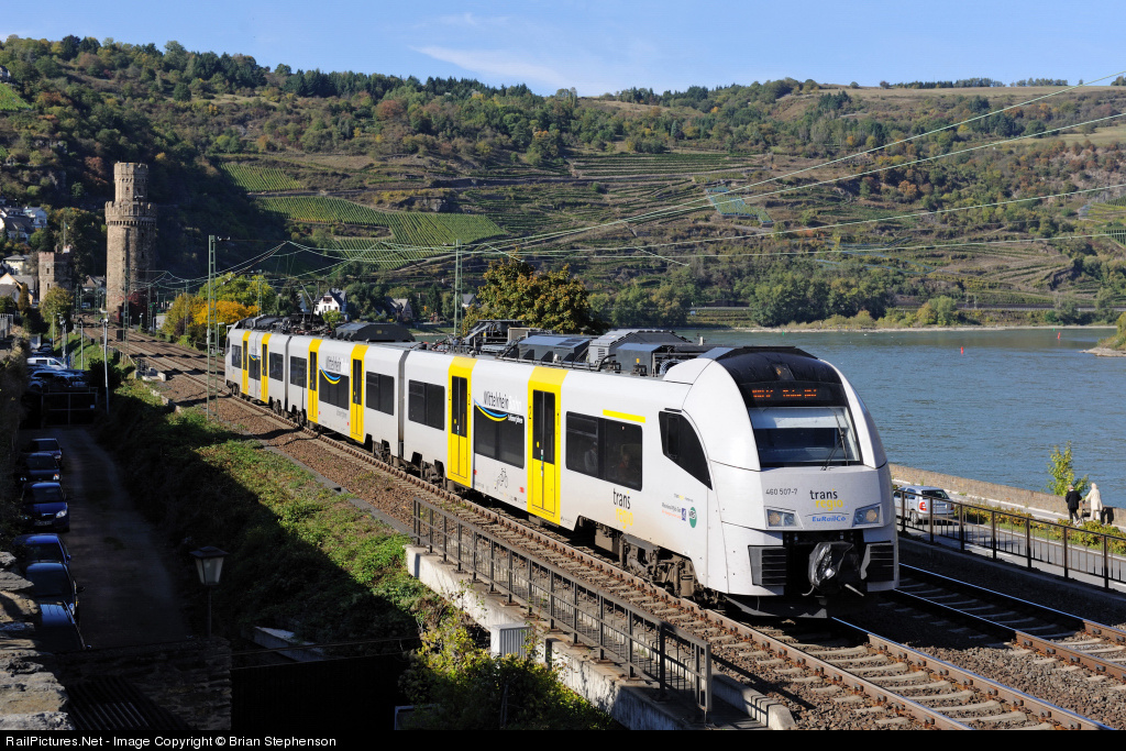 | The same Mittel Rhine Bahn working as my previous post is seen three days earlier arriving at Oberwesel forming the 14.53 Koblenz to Mainz service. Photo taken from the ancient town wall that runs beside the railway. The Gunderodehaus from where my previous photo was taken can just be seen in the top left hand corner. |