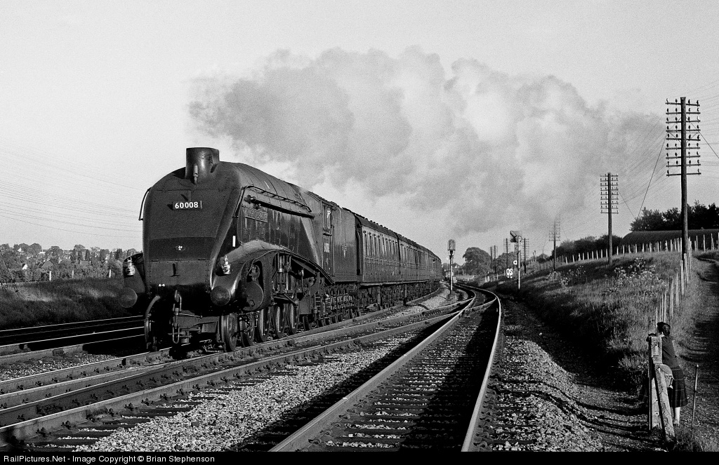 | Slightly over 50 years ago Gresley A4 Pacific No 60008 Dwight D. Eisenhower accelerates away from its stop at Potters Bar with the 7.15pm Kings Cross, London to Peterborough semi-fast train as my wife Mickey looks over the fence. This engine was built in 1937 for working the 'West Riding' streamlined train between Leeds and London and was originally named Golden Shuttle. It was renamed after the Allied Supreme Commander in September 1945 and was taken out of service in July 1963 and presented to the National Railroad Museum of Greenbay, Winconsin, USA. It has just been returned to the UK together No 60010 Dominion of Canda from the Expo Museum at Montreal, Canada for exhibition in the UK next year for the 75th annniversary of sister engine No 60022 Mallard's world speed record of 126 mph. |