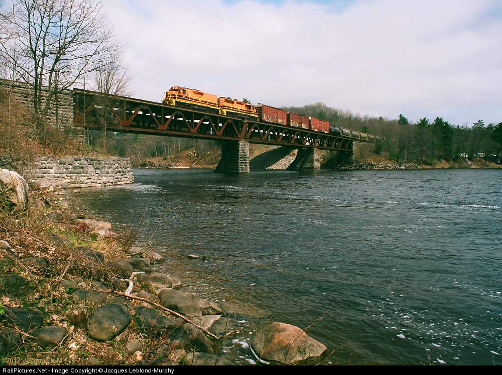Formerly known by its old CP number of 739, the Quebec-Gatineau's triweekly freight on the Lachute Sub rolls above the Rouge River on its way west.