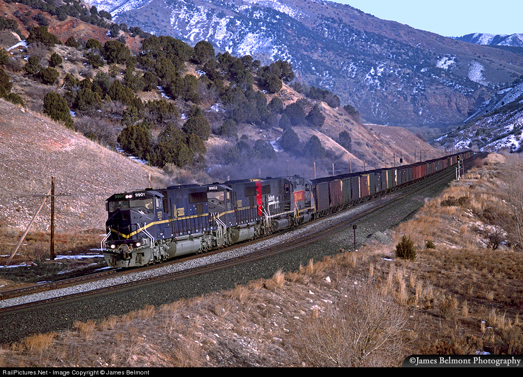 Prior to purchasing the entire production fleet of six units, the Utah Railway Company tested three of MPI's MK5000Cs in coal service on Soldier Summit. They only operated for about three months in demonstrator/SP paint prior to receiving a full gray/red repaint at MPI in Boise. Here's the second of only two photos I shot of the demonstrator trio headed west with 67 loads of coal approaching the Thistle Tunnels in Spanish Fork Canyon.