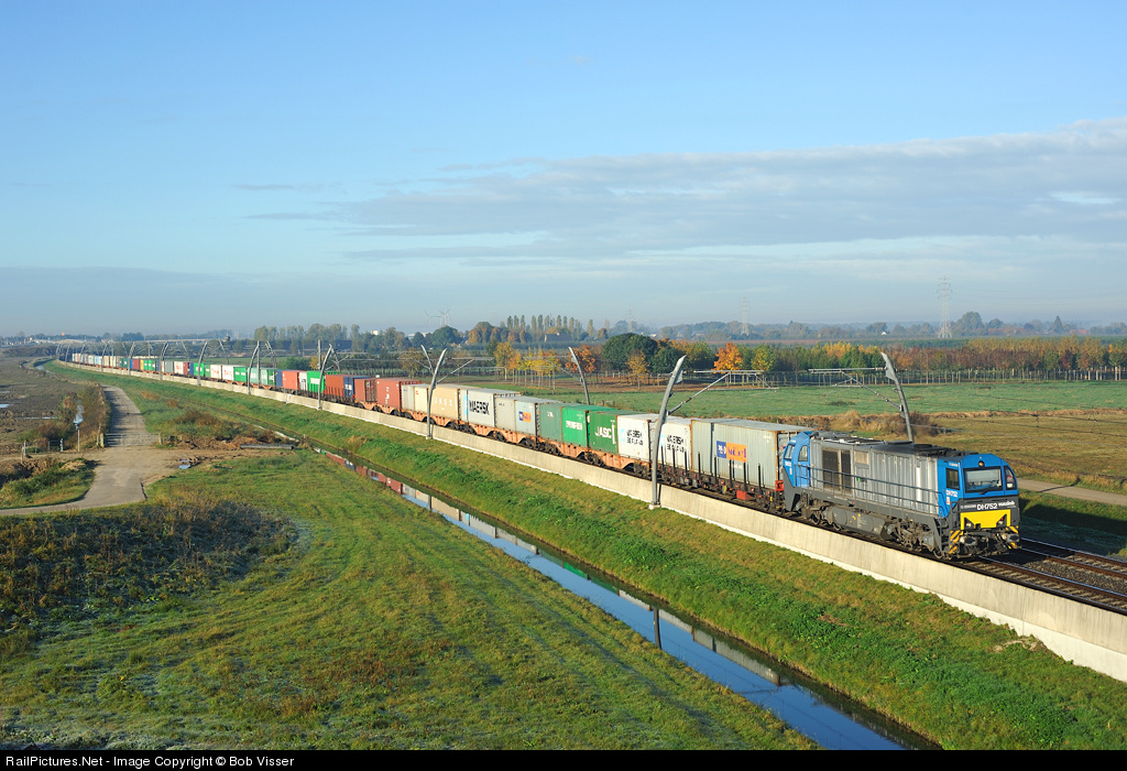 HGK DH752 with a containertrain from Rotterdam Maasvlakte to Düsseldorf and Köln. Note that the cabine is not as wide as the complete locomotive. This was the original shape of the G2000 as it was designed by Vossloh. But it found no mercy so all locomotives that were build afterwards have wide cabs.