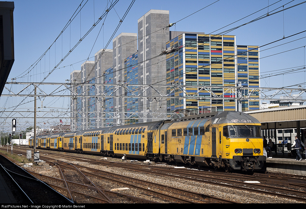 An 8-car 'DD-AR' EMU arrives at Leiden Centraal station. Each four car set consists of a driving trailer, two trailer cars and a motor car. The motor cars are of a very unusual design having only one passenger deck, with the lower deck taken up by electrical equipment. Even more unusual is that it has three bogies! They also feature both screw couplings and a special low-mounted multiple-unit coupling. These sets were delivered in the mid-90's, but (in my opinion) have dated very quickly. NS has begun a refurbishment program but at the time of my visit only a handful of sets had been completed.