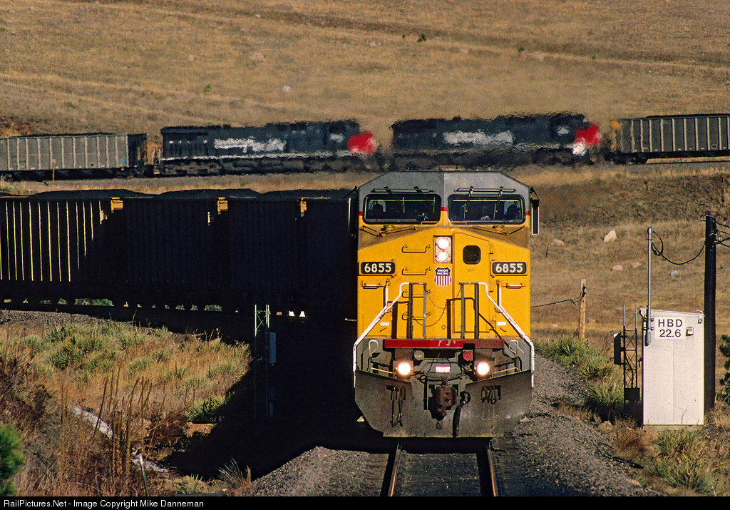 An eastbound Union Pacific coal train encircles Coal Creek Canyon on UP's Moffat Subdivision east past the detector at mile 22.6 on November 26, 1998. Two Southern Pacific AC4400CWs operating as mid-train DPUs are momentarily directly above on the other side of the canyon.