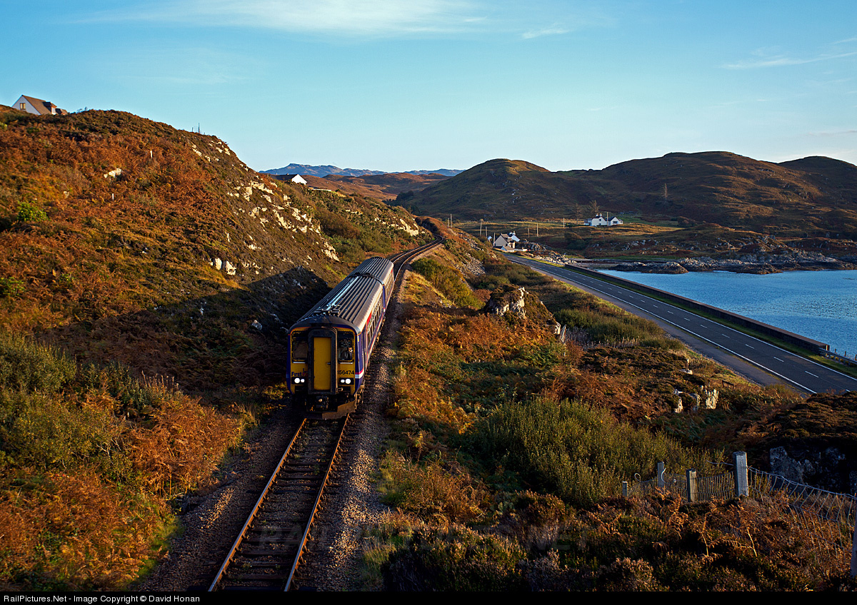 | The afternoon service from Glasgow to Mallaig is only a short distance from its ultimate destination as it drifts downgrade alongside the A830 and Glasnacardoch Bay. Behind lie the rugged hills that are the last obstacle facing the West Highland Line before it reaches the sea; in just a couple minutes the train's passengers will be spilling out onto the main street of Mallaig in search of home, lodging or the excellent seafood for which this town is known. |
