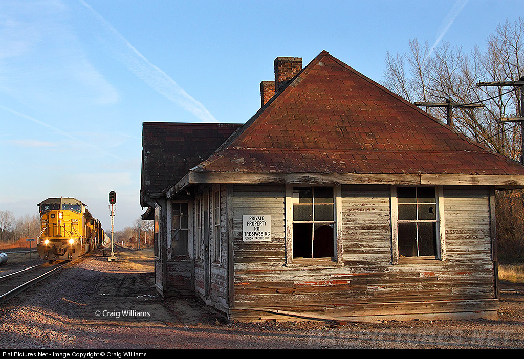 | Manifest train from Proviso Yard, IL, to South St. Paul, MN, passes the vacant depot at Oxford. |