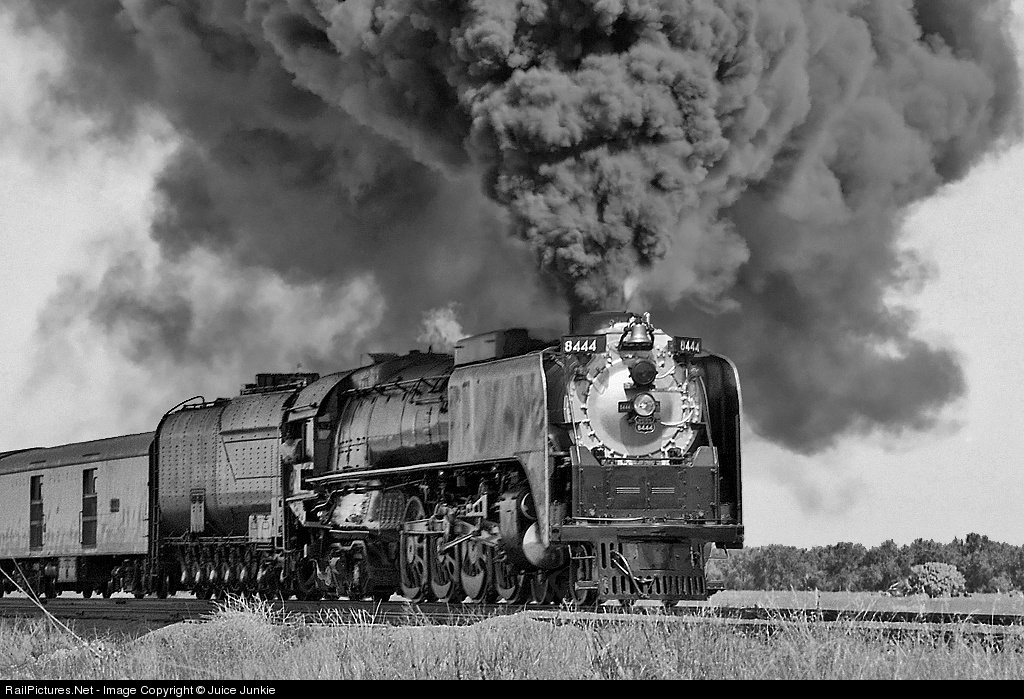 The 1982 NRHS Convention was held in Denver, Colorado. The schedule included an excursion trip from Denver to Sterling and return. Union Pacific 8444 was the power for this trip. Union Pacific Class FEF-3 was built by the American Locomotive Company in December 1944. She has 80 inch drivers, boiler pressure of 300 lbs, 25 x 32 inch Cylinders and can deliver 63,750 pounds of tractive effort. This image shows UP 8444 and her train really smoking it up during one of many runbys that day.
