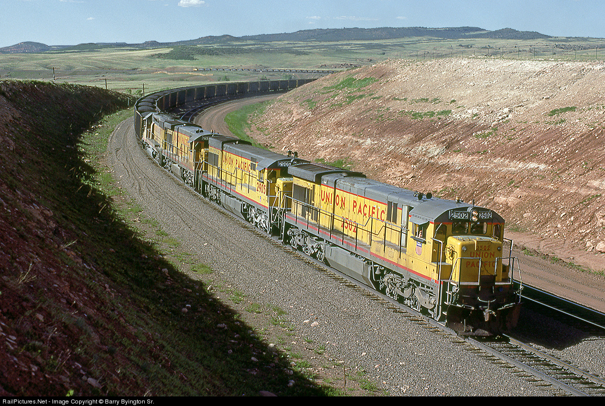 Something you don't see on Sherman Hill and environs: green foliage! After all the snowdrifts and permafrost have melted, there is a very short time when the Spring attempts to take hold, but alas, in a few weeks everything will be brown again and back to normal. Here a loaded coal from Hanna is eastbound on the Colores line, it's caboose accentuating the scene in the distance above the train in the curve. This view is looking west from photo #387320.