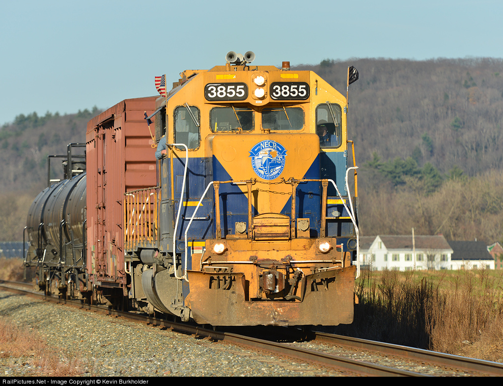 On Saturday, November 10, New England Central's infrequent 'Key Train' - usually hauling haz mat cars that aren't moved in regular freight between St. Albans and Willimantic, Connecticut - made a daylight run through the lower White River and Connecticut River Valleys. NECR GP38 3855 was decked out with various flags, including the US and POW-MIA on the cab and the Vermont state on the long hood rear, that were placed their by proud engineer Joe D. The flags are clearly visible as the train heads south at Westminster, VT and through some southern Vermont farm land.