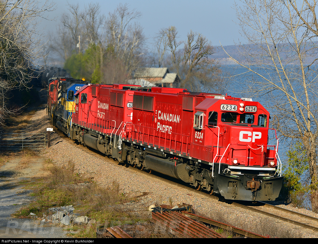 In the aftermath of Superstorm Sandy, ethanol trains that had been normally routed to New Jersey on CSX have been detoured to a CP/VRS/NECR/P&W routing via the Green Mountain Gateway. On Veteran's Day, CP train 644-607 is rolling along Lake Champlain with a pair of former Soo Line SD60s decked out in CP paint ahead of an ICE and CP SD40-2. The consist, CP 6234, CP 6243, ICE 6426 and CP 6018 is seen snaking southbound on the Canadian Mainline Subdivision along Lake Champlain at Putnam Station, NY.