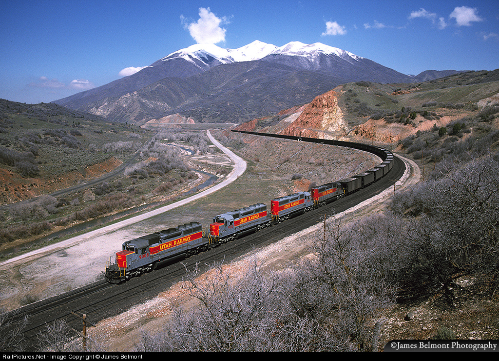 A well matched quartet of Utah Railway SD40s lead a Moapa, NV to Wildcat, UT coal empty east through Spanish Fork Canyon approaching the Thistle Tunnels. Note the former D&RGW grade and Highway 6 bracketing the Spanish Fork River below. Snowy Maple Mountain rises to 9088 ft. above sea level in the background.