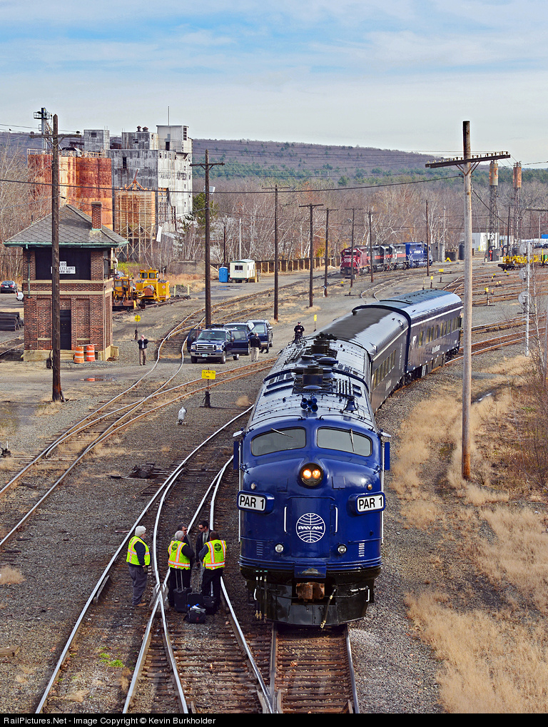 On November 15, Pan Am operated an office car special from Worcester to East Deerfield Yard, Massachusetts, then north on the Connecticut River Line to East Northfield, MA to inspect the rail work that has been ongoing. The OCS-15 is detraining passengers as a crew change takes place at the head end of the office car train.