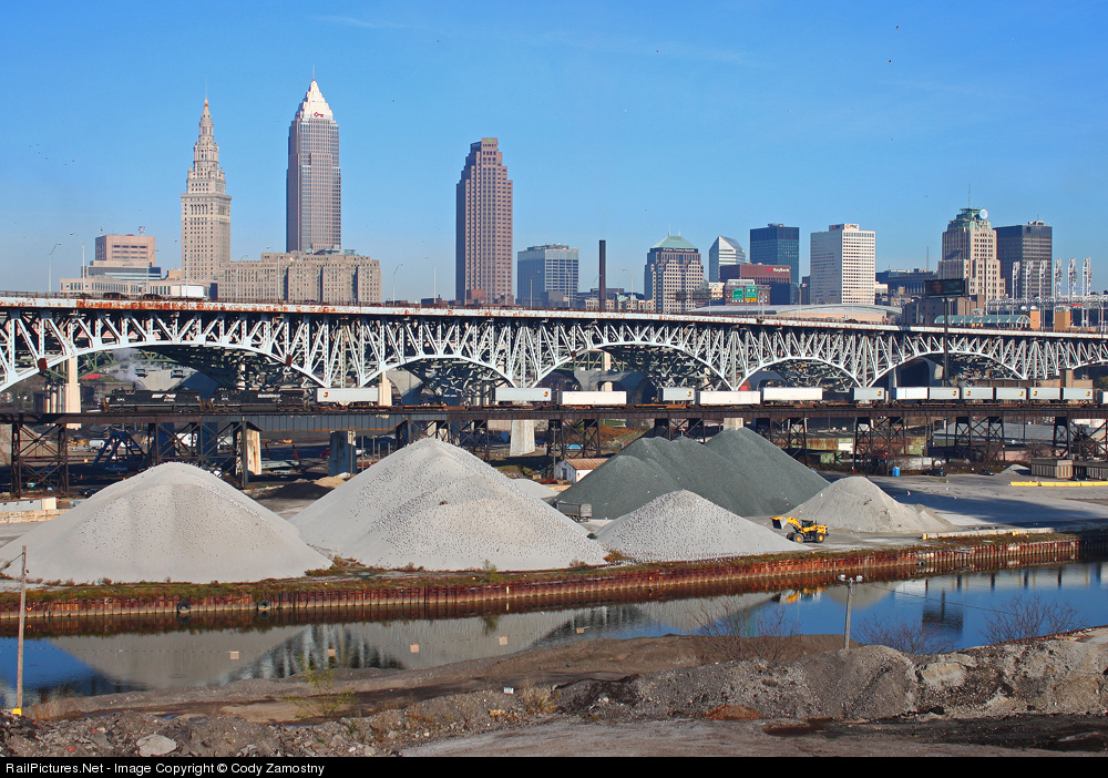A pair of standard cab GE products are in charge of 205, backed by the city skyline while passing over the Flats of Cleveland on the Nickel Plate-constructed viaduct.