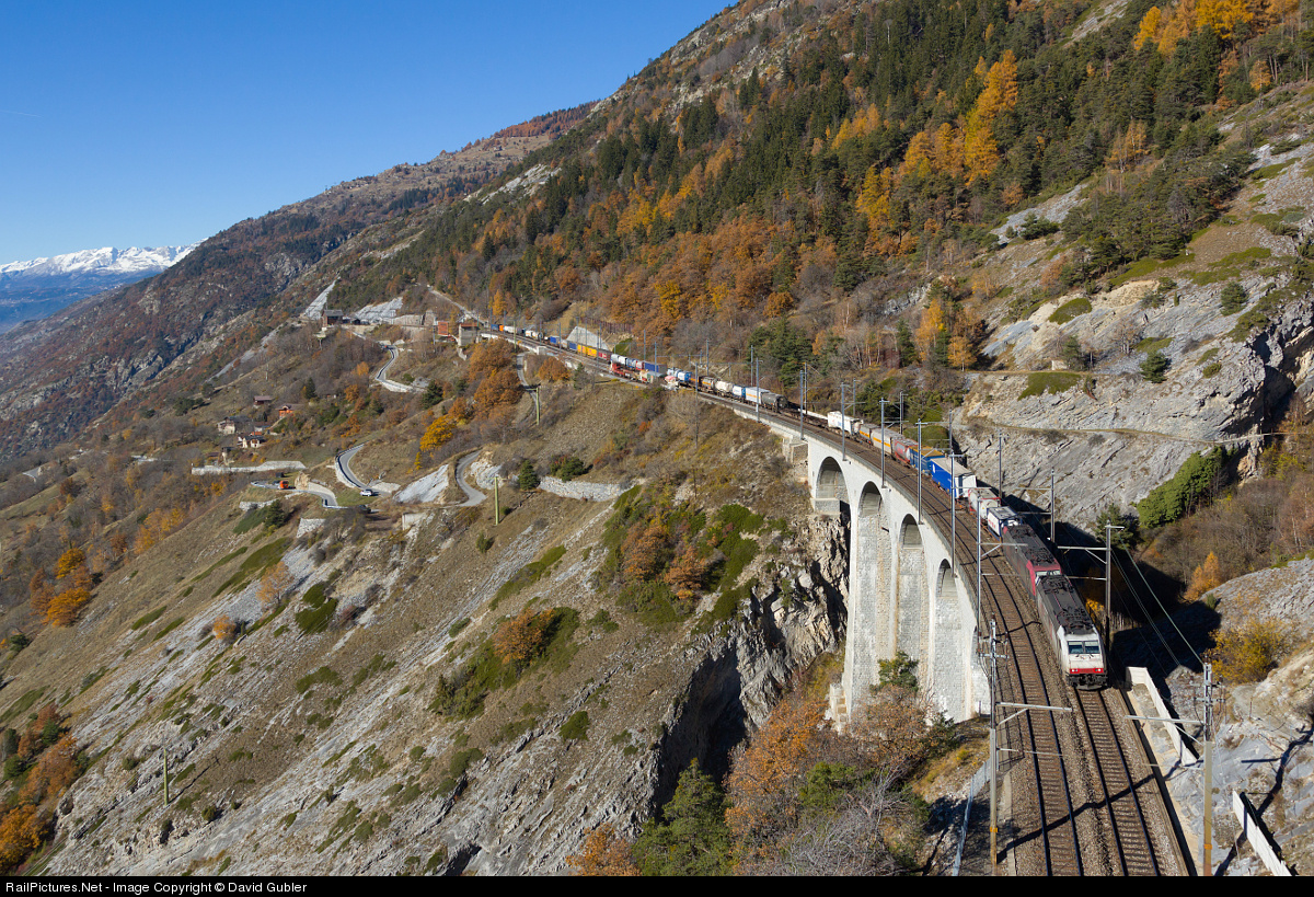 Two Crossrail 185 are crossing the Luogelkin viaduct on their steep (26‰) way down to Italy.