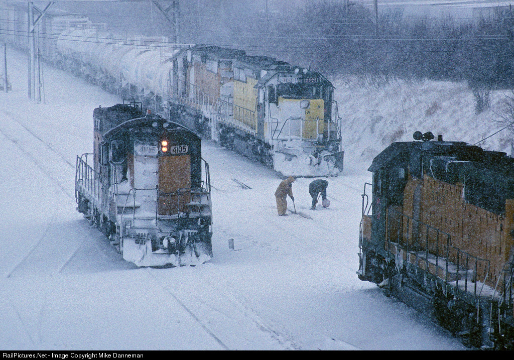 On December 3, 1990, Chicago and North Western’s PRGBA (Proviso Yard to Green Bay freight) has finished making a setout at Butler Yard. Snow is coming down hard, and is starting to cover the rails. An eastbound (southbound) military extra with a GP40 on the point has come to a stop at the reversed switch on the crossover. The crew of yard engine GP7 No. 4105 has also come over to help the crew of PRGBA clean out the switch. Soon, both trains will be on there way, and the switcher will go back to work shuffling cars in the yard. In the middle of a Wisconsin blizzard, railroading doesn’t stop for the weather.