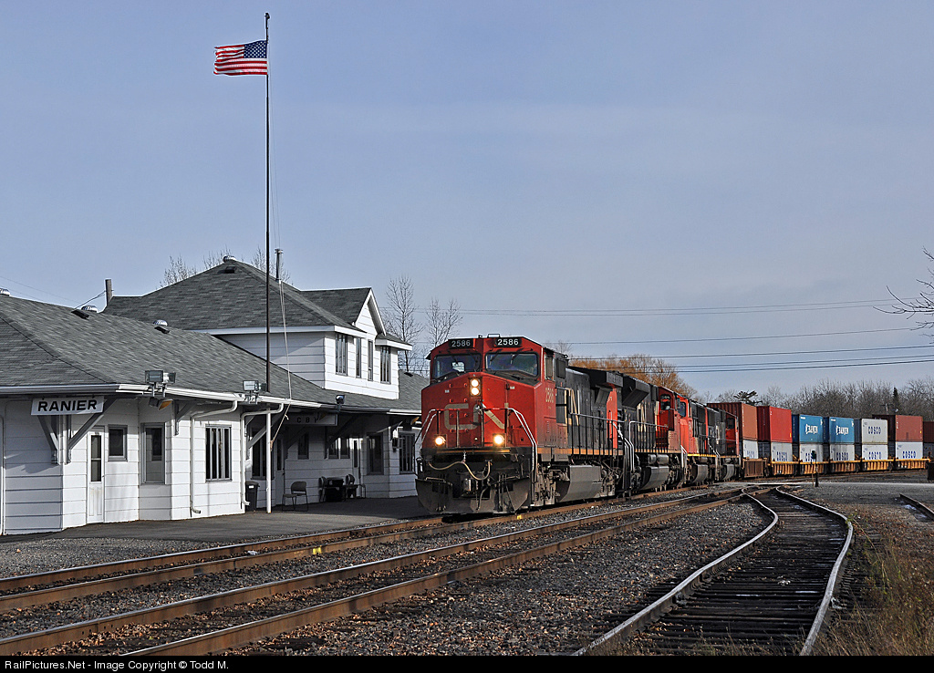 | A CN stack train just got a new crew and starts out on it's journey into Canada. The train is about 1000 feet from the International Bridge which seperates Ranier, MN and Fort Frances, Ont. or the United States and Canada. The depot is former DW&P and now operates as a U.S. Customs building and crew change point for CN trains entering and leaving the U.S.